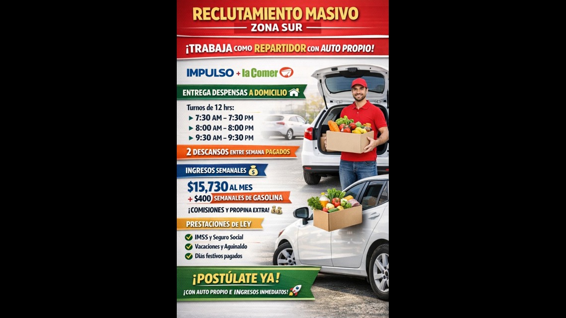 Reclutamiento Masivo Repartidores con auto propio Zona Sur - Semana Completa con 2 descansos x semana